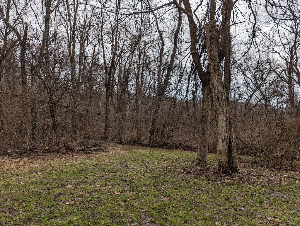A decidedly mediocre photograph of one of my favorite spots along the trail. Just some green grass with a bunch of brown trees and brush, bare of all their leaves, against a gray/blue sky.