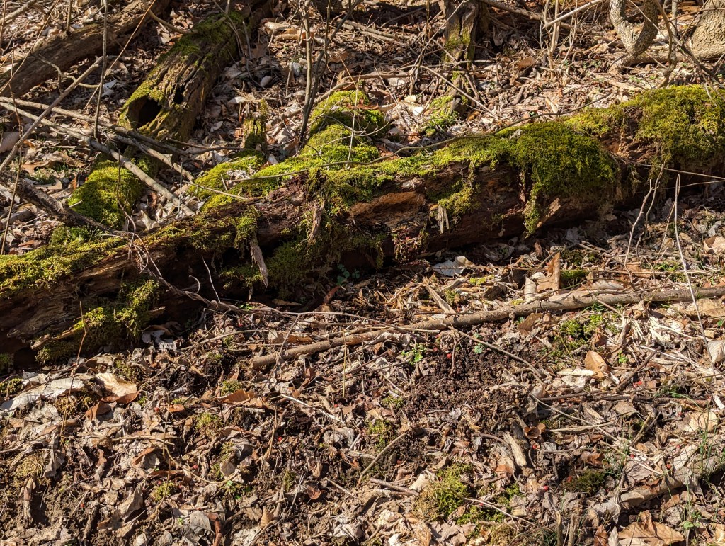 Moss growing on a log resting on a forest floor covered in dead leaves.